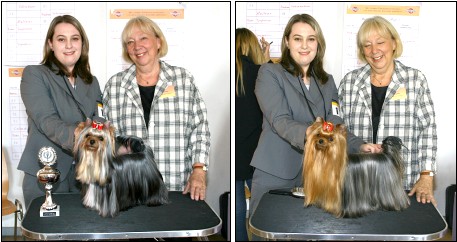 Oben links: Little Guardian's Attention I'm Exclusive (BJH), oben rechts: Sweet Magic's Always on my Mind (BOB), Besitzerin beider Yorkies (li): Simone Ludwig. Richterin (re): Frau Gunilla Kühni-Stenberg / CH. Links: Captain Jack of Padawi's (BOS), B: Gabriele Funk & Siegrun Dawin.